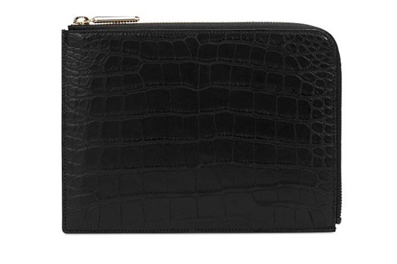 - Black slim pouch in exotic alligator skin.